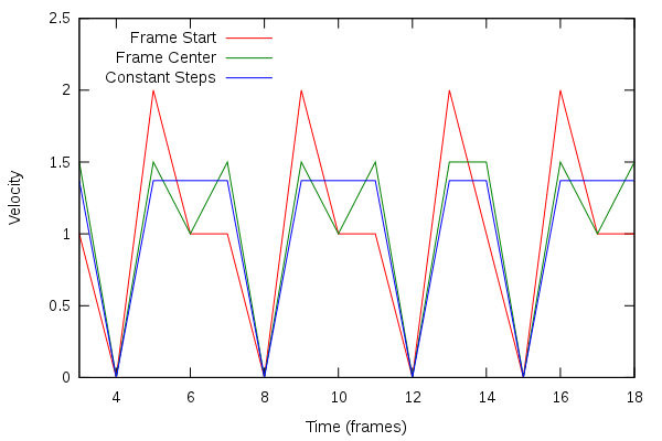 Here we see that in terms of providing consistent motion velocity, Constant Steps is actually is a bit better than the Frame Center at all times.