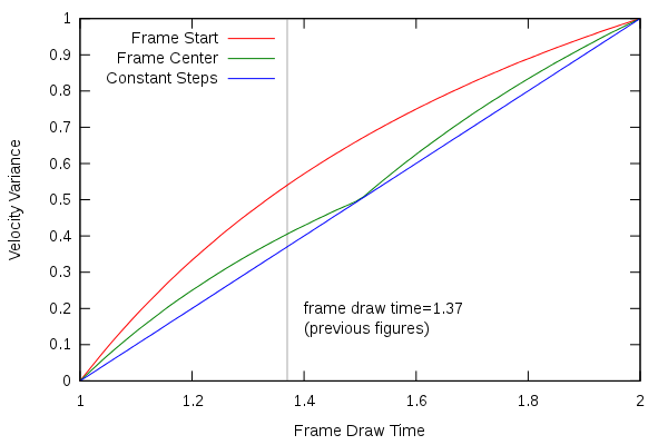 The “Frame Start” and “Frame Center” lines represent the two methods described in the last post. We either choose position of objects in the frame based on the theoretical position at the start of the time that the frame will be displayed, or at the center of the frame time. The third line “Constant Steps” shows a method that wasn’t described in the last post, but you would have seen if you tried the demo: it’s actually the simplest possible algorithm you can imagine: compute the positions of objects at the current time, draw the frame as fast as possible, start a new frame.