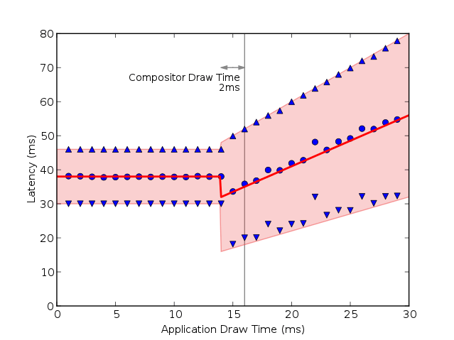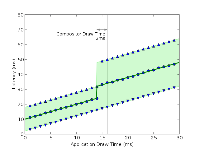 This is basically working pretty well – but we note that even though the application is drawing quickly and the entire system is unloaded we still have a lot of input latency. If we plot the latency versus the application drawing time it looks like: