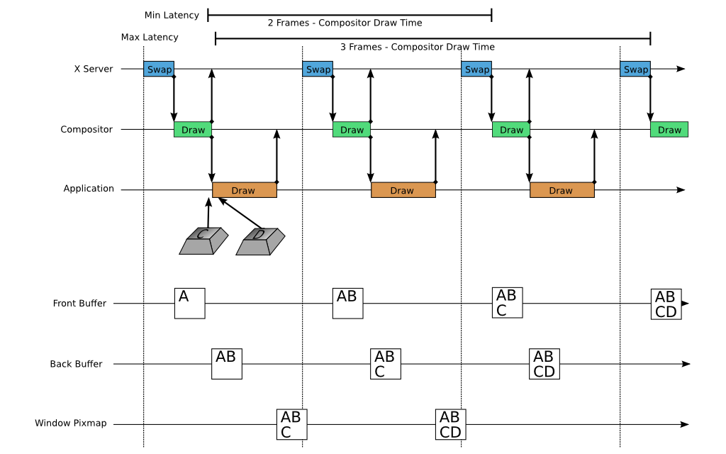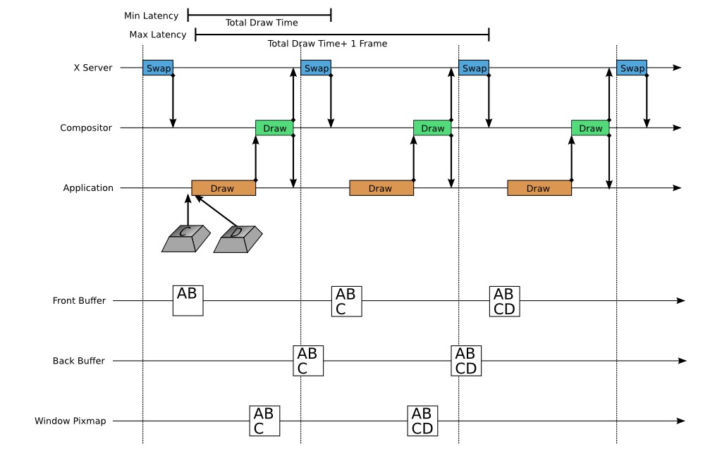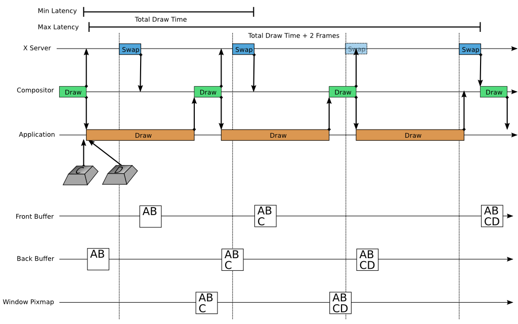 The top section shows a timeline of activity for the Application, Compositor, and X server. At the bottom, we show the contents of the application’s window pixmap, the back buffer, and the front buffer as time progresses. From this, we can get an idea of the time between the point where a user hits a key and the point where that displays on the screen: the input latency. The keystroke C almost immediately makes its way into a new application frame, and that new frame is almost immediately drawn by the compositor into the back buffer, and the back buffer is almost immediately swapped by the X server. On the other hand, the keystroke D suffers multiple delays.