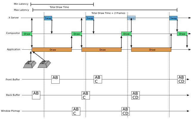 And then there’s triple-buffering, used in some video games, in which you keep rendering frames as fast as possible to two alternating backing buffers even if you’re rendering faster than the swap interval, and the swap takes the most recently rendered of the two back buffers and swaps it with the front buffer, thus three buffers total. This of course spins the cpu and gpu and wastes a lot of power…